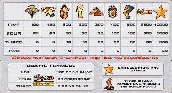Serpent's Treasure is a five reel slot machine. Each time a spin is made, the three reels come to rest randomly with a selection of symbols showing in the game window. Certain combinations of symbols results in payoffs. Consult the payout chart for reference to the amounts paid.