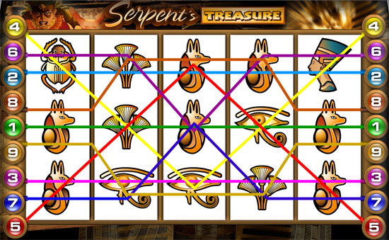 The objective of Serpent's Treasure is to match the symbols of each one of the five reels to a winning combination. This is a five reel multi-pay line slot game which has 9 pay lines. Payouts depend on what symbols will match on a line.